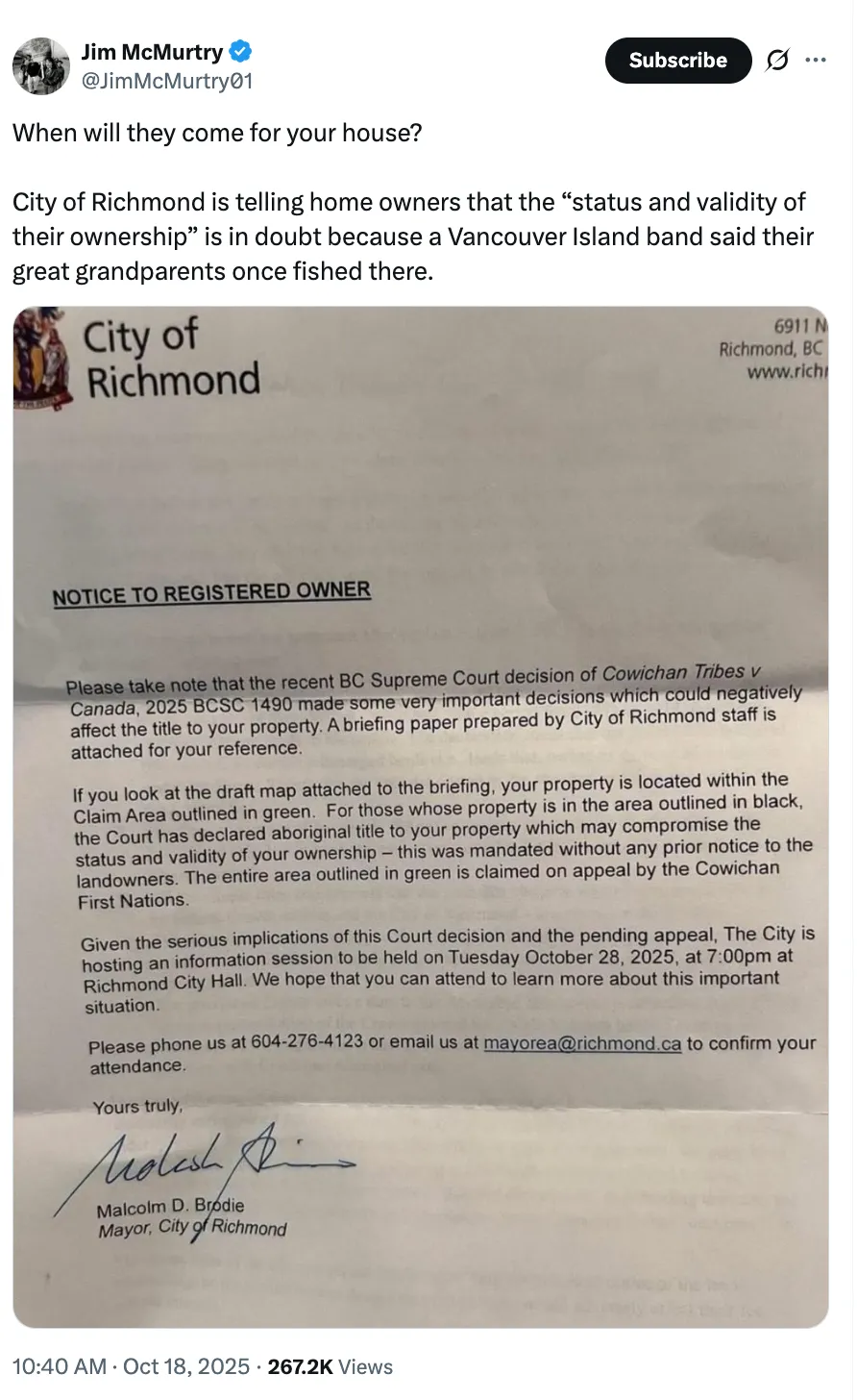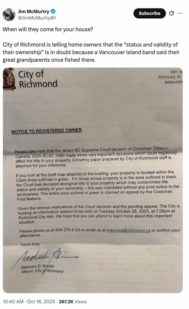 Hundreds of Richmond, British Columbia, homeowners have been warned their private property could be jeopardized by a recent court ruling granting Aboriginal title to the Cowichan Tribes.